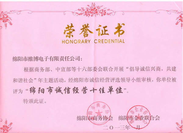 綿陽市誠信經(jīng)營十佳單位