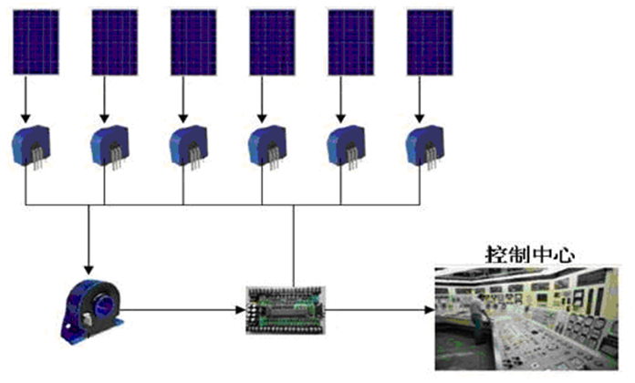 WBI021TK02-3產(chǎn)品采用閉環(huán)霍爾效應(yīng)原理,用于精密測量直流、交流和脈沖電流,將其變換為標(biāo)準(zhǔn)的跟蹤電壓輸出;具有體積小, 響應(yīng)速度快, 動(dòng)態(tài)性能好,過載能力強(qiáng),高精度、高隔離、高可靠、低漂移等特點(diǎn)。產(chǎn)品對(duì)每一路的光伏電池板電流進(jìn)行監(jiān)測,根據(jù)光伏匯流箱的路數(shù)不同進(jìn)行匹配。采用5V單電源供電,輸出信號(hào)為2.5V±0.625V,輸出的信號(hào)給采集裝置,通過采集板轉(zhuǎn)換,最終送到監(jiān)控室,監(jiān)控中心統(tǒng)一對(duì)每個(gè)陣列的電池板發(fā)電情況進(jìn)行實(shí)時(shí)在線監(jiān)測,使工作人員及時(shí)對(duì)出現(xiàn)問題電池板進(jìn)行處理。系統(tǒng)架構(gòu)如下圖: